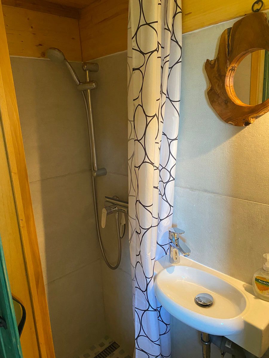 The small kitchenette is equipped with electric double cooker, camping mini fridge, Italian coffee maker, cooking utensils, table ware and glasses as well as a basic spice selection.