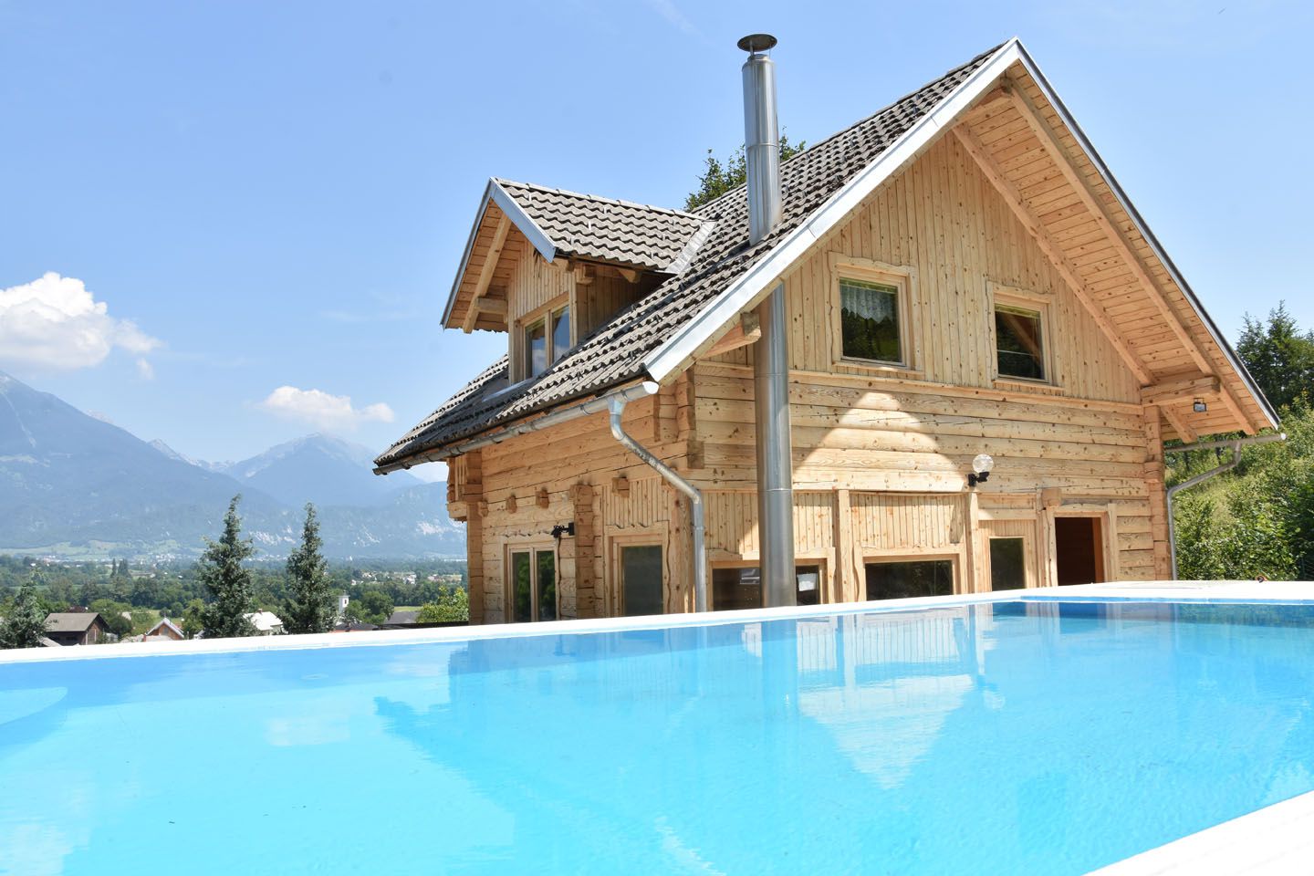 As the local Slovenes are happy to swim in the gorgeous lake Bled and their sparkling clean rivers, it is unusual for villas to have swimming pools. However, Villa Edelweiss in Bled has a heated, infinity swimming pool and for the families it is important to know that the pool is fenced off from the rest of the garden and there are also pool toys for the use of guests. In addition, one end of the pool is shallow. On the sunbathing patio around the pool there are sunbeds, parasols and a barbecue, with an outdoor dining table.
